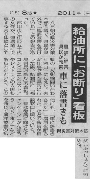 8日の福島県災害対策本部会議で、郡山市の50代女性から運送業の夫が静岡県内の給油所で「福島県民お断り」の看板を見たとの通報があったと報告。コンビニやレストランの入店も断られたという。このほか「車に落書きされた」「宿泊を断られた」などの風評被害があったという。これは、より真実を述べたと言うよりは、句読点の打ち方も主語も怪しい元記事を要約する際の表記ミスだと考えた方が自然です。